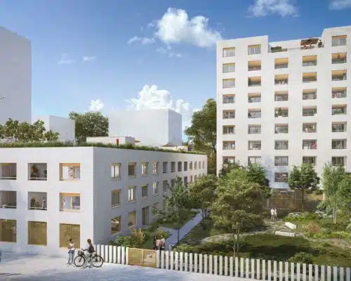 Au centre, un îlot paysager et des jardins partagés sur le toit créent des espaces de convivialité et de détente. La résidence privilégie les mobilités douces avec des locaux vélos et garantit sécurité et sérénité grâce à la vidéosurveillance et au contrôle d’accès.